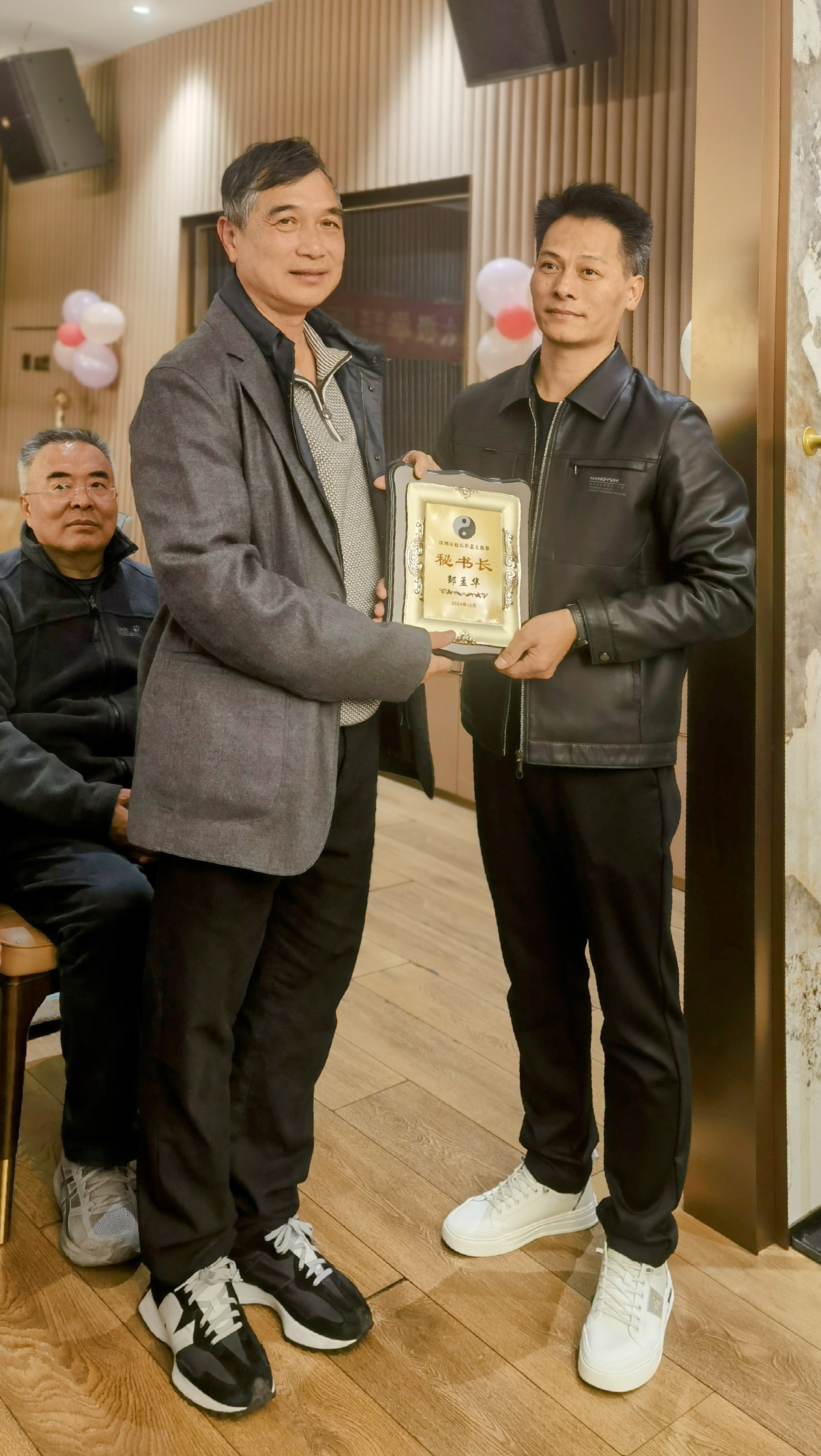 林文辉(左)给邹孟华(右)颁发深圳市赵氏形意太极拳协会秘书长铭牌