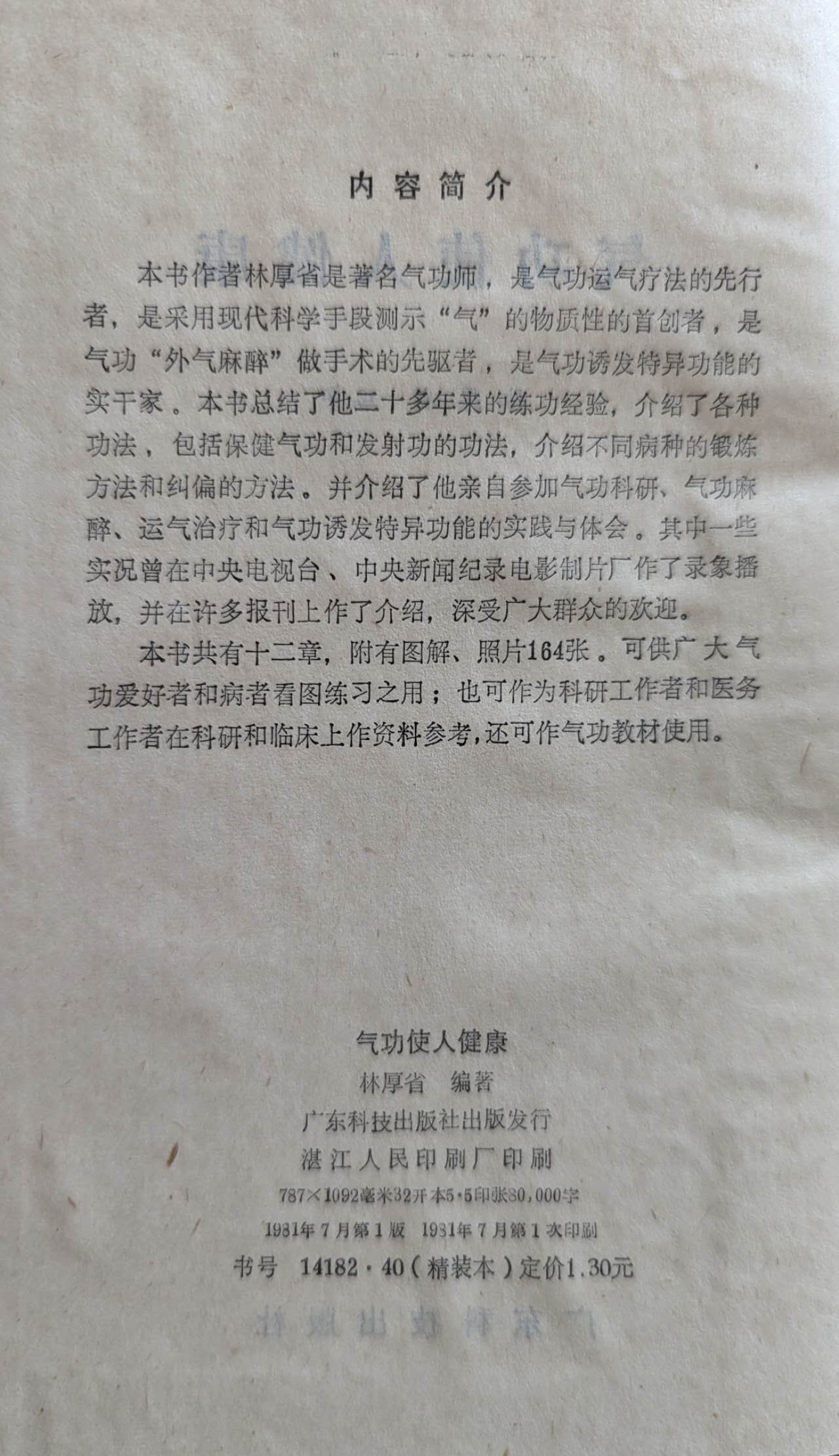 本书出版于1981年7月,作者林厚省是著名气功师,是气功运气疗法的先行者,是采用现代科学手段测示“气”的物质性的首创者,是气功“外气麻醉”做手术的先驱者,是气功诱发特异功能的实干家。本书总结了他二十多年来的练功经验,介绍了各种功法,包括保健气功和发射功的功法,介绍不同病种的锻炼方法和纠偏的方法。并介绍了他亲自参加气功科研、气功醉、运气治疗和气功诱发特异功能的实践与体会。其中一些实况曾在中央电视台、中央新闻纪录电影制片厂作了录象播放,并在许多报刊上作了介绍,深受广大群众的欢迎。