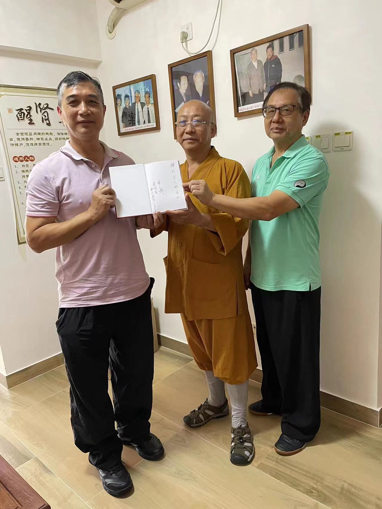 左起:香港气功太极社名誉顾问巫朝晖先生、嵩山少林寺第三十二代皈依弟子释行者大师、香港气功太极社